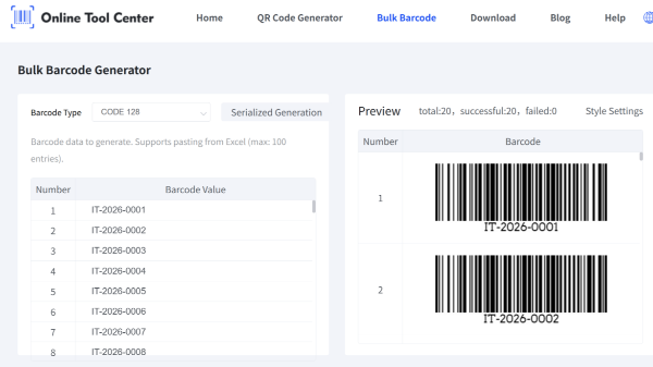 Стварыць некалькі штрых-кодаў у масавым выглядзе з Excel або CSV. Бясплатны онлайн некалькі генератараў штрых-кодаў, якія падтрымліваюць код 128, EAN-13, UPC-A і гатовыя да друку экспартныя фарматы.